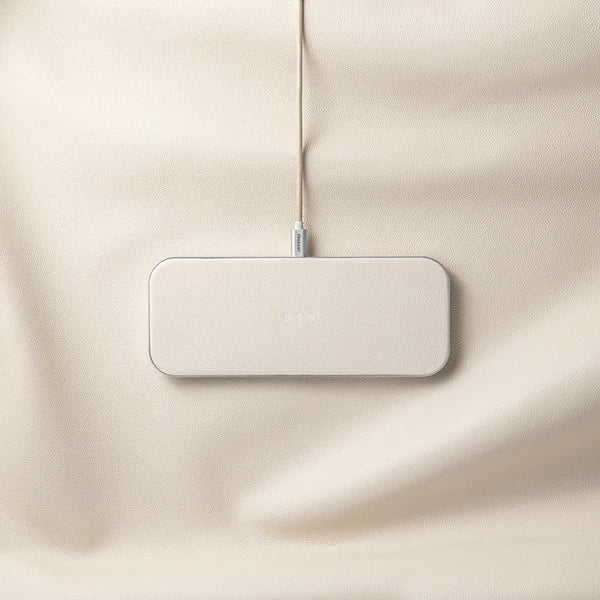 Wireless charging transfers energy from a transmitter (i.e. wireless charger) to a receiver (i.e. your phone) without a cable. Simply, plug in the Courant device, align your phone on the three-dot area, and charge without struggling to find your charging cord each time.
